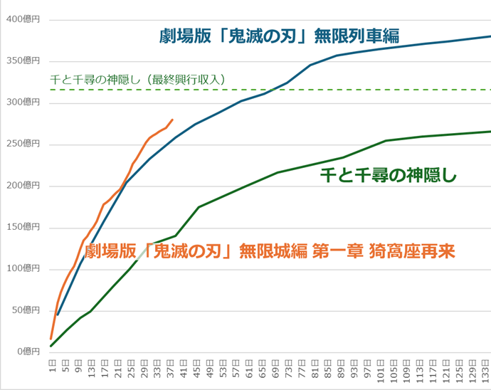現在の国内歴代興収の1位は『劇場版「鬼滅の刃」無限列車編』で407.5億円(2020年)、2位は『千と千尋の神隠し』で316.8億円(2001年)となっている。