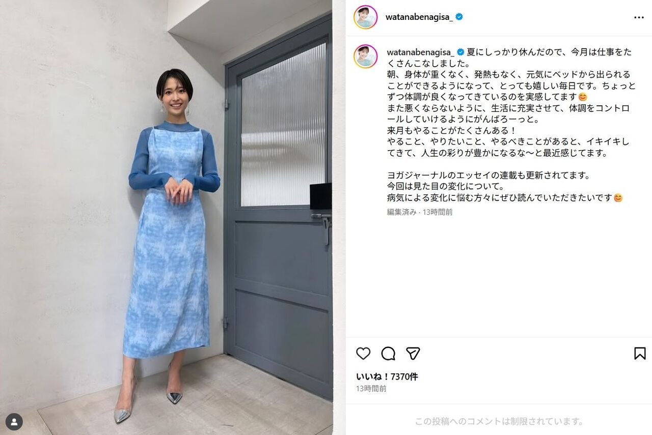 昨年8月でフジテレビを退社し、同10月にPTSDを公表した渡邊渚アナウンサーが31日、公式インスタグラムを更新。